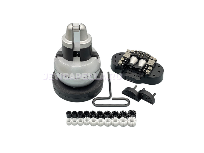 Универсальный инструмент для крепления ювелирных изделий и заготовок при гравировке. Помещен на подставку, что позволяет легко его поворачивать под необходимым углом. В комплект входят зажимные вставки и штифты, с помощью которых можно фиксировать изделия самых различных форм и размеров.